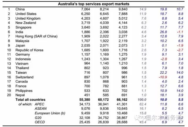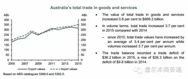 據報告,2015年澳對外貨物及服務貿易總額達6693億澳元,同比增長0.8%。其中,出口同比下降3.2%,為3166億澳元,進口同比增長4.7%,達3527億澳元。相較貨物貿易,服務貿易成為澳外貿增長新動力,2015年澳服貿出口同比增長10%,達661.6億澳元,凈增60億澳元。其中,中國自澳服務貿易進口達98.4億澳元,增長19.8%,進口額及增速均居各國前列,帶動澳服貿出口增長2.7個百分點。隨著大量中國留學生赴澳學習生活,澳教育及相關服貿出口已在2015年超過天然氣出口,首次躋身澳三大出口產業之列。