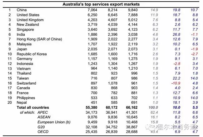 澳大利亞貿易委員會(Austrade)日前發布最新一期《澳大利亞貿易結構報告》,呈現該國外貿結構轉型新變化,主要特點是服貿出口蓬勃發展,外貿優勢產品正從礦產資源類轉向農牧物產類,而來自中國的巨大需求是澳外貿轉型的主要促動元素。