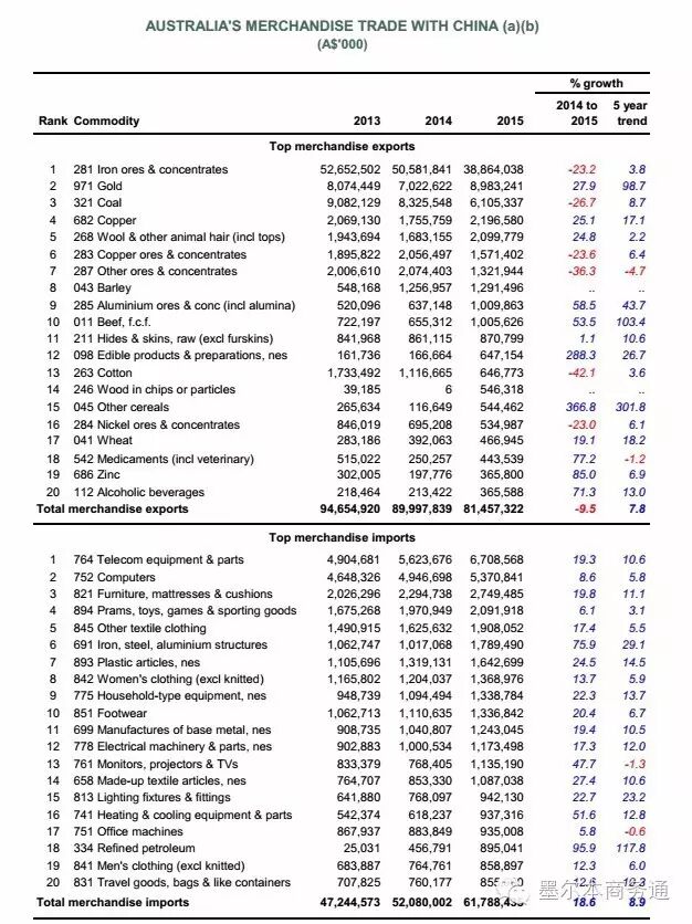 據報告,2015年澳對外貨物及服務貿易總額達6693億澳元,同比增長0.8%。其中,出口同比下降3.2%,為3166億澳元,進口同比增長4.7%,達3527億澳元。相較貨物貿易,服務貿易成為澳外貿增長新動力,2015年澳服貿出口同比增長10%,達661.6億澳元,凈增60億澳元。其中,中國自澳服務貿易進口達98.4億澳元,增長19.8%,進口額及增速均居各國前列,帶動澳服貿出口增長2.7個百分點。隨著大量中國留學生赴澳學習生活,澳教育及相關服貿出口已在2015年超過天然氣出口,首次躋身澳三大出口產業之列。