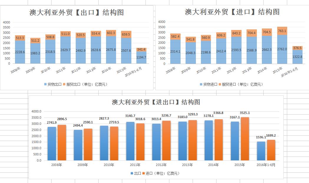 根據澳大利亞國家統計局公布的最新國際貿易數據表明,2016年1-6月澳大利亞貨物貿易進出口總額為2402億澳元,同比下滑4%;其中進口1234.2億澳元,出口1167.8億澳元,同比分別下降2.9%和5.1%;貿易順差66.4億澳元,較上年同期順差值(40億澳元)有所擴大。