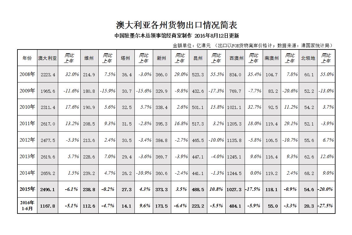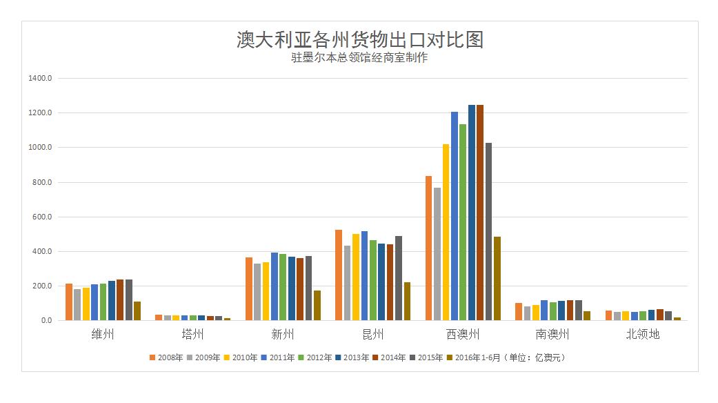 2016年上半年,澳對華貨物出口同比下滑2.1%,降幅較2015年收窄。塔州、維州對華出口增長較快,兩州對華進出口貿易所占比重均創歷史新高。