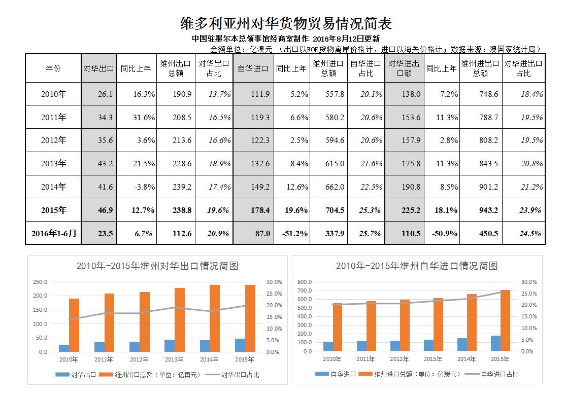 據統計,1-6月,維州對華貨物出口23.5億澳元,同比增長6.7%,占該州貨物出口額(112.6億澳元)比重升至20.9%,比重首次超過兩成。同期,維州自華進口87億澳元,同比增長7.9%;對華進出口貨物貿易合計110.5億澳元,同比增長7.6%,占總量比重升至24.5%,創歷史新高。