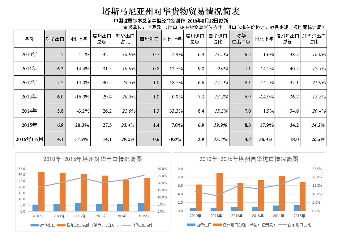 2016年1-6月,塔州對華貨物出口4.1億澳元,同比增長77.9%,占該州貨物出口額(14.1億澳元)比重升至29.2%,在2015年達到歷史高位(25.4%)基礎上再次刷新紀錄。同期,塔州自華進口貨物0.6億澳元,同比下降9%;對華進出口貨物貿易合計4.7億澳元,同比增長58.4%,占總量比重升至26.3%。