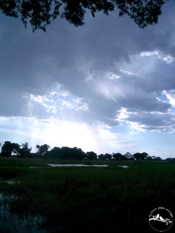 After cooling off for some lunch we slid back into our Mokoro and headed back out in the opposite direction. As the thunder rolled and dramatically cracked overhead we made our way across mud flats pivoted with hoof prints to a nearby hippo pool where we stood breathless watching their little ears waggle before they would snort a spray of water and submerge themselves once again. Wandering off again into the bush we came so close to a herd of zebras that we frightened them into galloping away in a cloud of dust. We continued on, making fresh footprints amongst the animal prints knowing we were the first to explore this area (not ever, but certainly in days). We passed a rotting buffalo carcass and nearby we see a large footprint in the dust but our guide informs us it is a hyena print, though he not so discreetly changes directions. Over drinks later on we learned that others had come across lions with a fresh kill and that it was in the area we were walking and that it was highly likely that we walked right by without seeing them, but I have no doubts that they saw us!