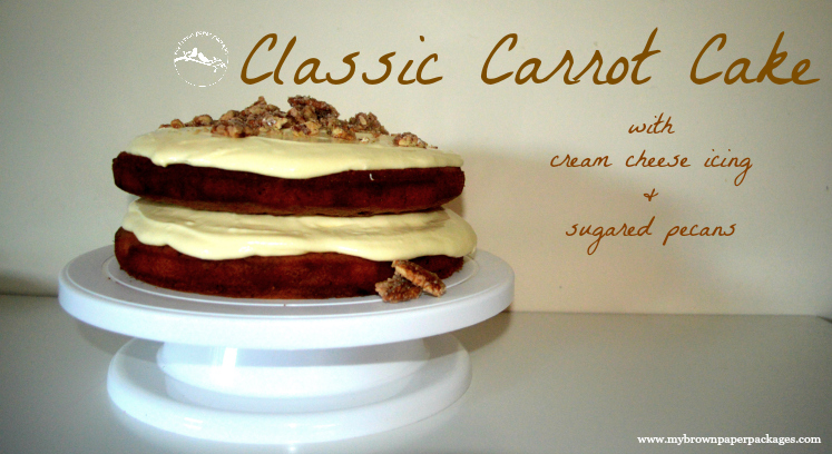 Every birthday I offer my husband the choice of whatever cake he would like for his birthday. Previously, he asked for this baked white chocolate cheesecake which I made with pistachios and a pomegranate syrup and a chocolate collar. It was pretty amazing. Anyway, this birthday he requested a carrot cake. So, not being one to do things by halves, I made a layered carrot cake with a cream cheese icing and sugared pecans.