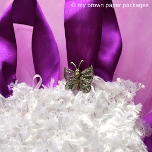 I used an old butterfly brooch covered in glitter to attach the other front side. This method allowed me to adjust the length of the straps and also makes the dress easier to get on and off.