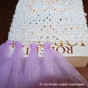 To attach the tulle strips you simply fold your tulle in half and thread the looped end through a hole until it is just sticking out.
