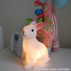 A rabbit night-light is a recent addition that I adore. And I love the vintage alphabet cards I printed, which are changed over on a regular basis. I also printed a large poster of some dandelions and the quote ‘Once upon a time …’.