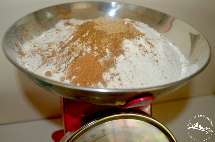- Sift flour, baking powder, cinnamon, ginger, nutmeg and sugar into a bowl and mix to combine.