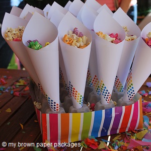 Popcorn is a fun party food but it’s no fun to have sticky little hands plunging into the bowl over and over again. So I decided to make little paper cones and fill each one with a mix of plain and coloured popcorn for my girls birthday party. Easy finger food for both the big and little kids. All I did was cut a piece of plain white A4 paper in half, roll it into a cone and I used a bit of rainbow heart printed washi tape to hold it in place.