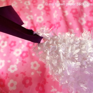 To attach the tulle strips you simply fold your tulle in half and thread the looped end through a hole until it is just sticking out.