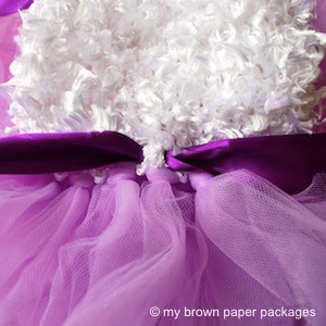 To finish it off I used a double-sided satin ribbon around the waist and made the length of the ribbon tails the same as the dress. Remember to allow enough length to tie the bow. This also helps hide the tulle joins.